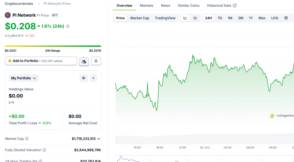 At present, PI is fighting to maintain stability near the $0.20 mark, a level that has acted as both psychological and technical support. Friday’s broad crypto sell-off once again dragged the token lower, erasing its short-lived gains earlier in the week. Analysts believe that sustaining price action above $0.20 is crucial for restoring market confidence.
