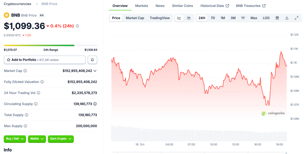 From a technical standpoint, BNB is consolidating within a descending channel but continues to defend key support between $1,100 and $1,120. The token’s bounce from a weekly low of $1,040 signals accumulation at lower levels. However, short-term momentum remains fragile, with the 50-day exponential moving average (EMA) still trailing the 100-day EMA—a pattern that often precedes temporary consolidation phases.
