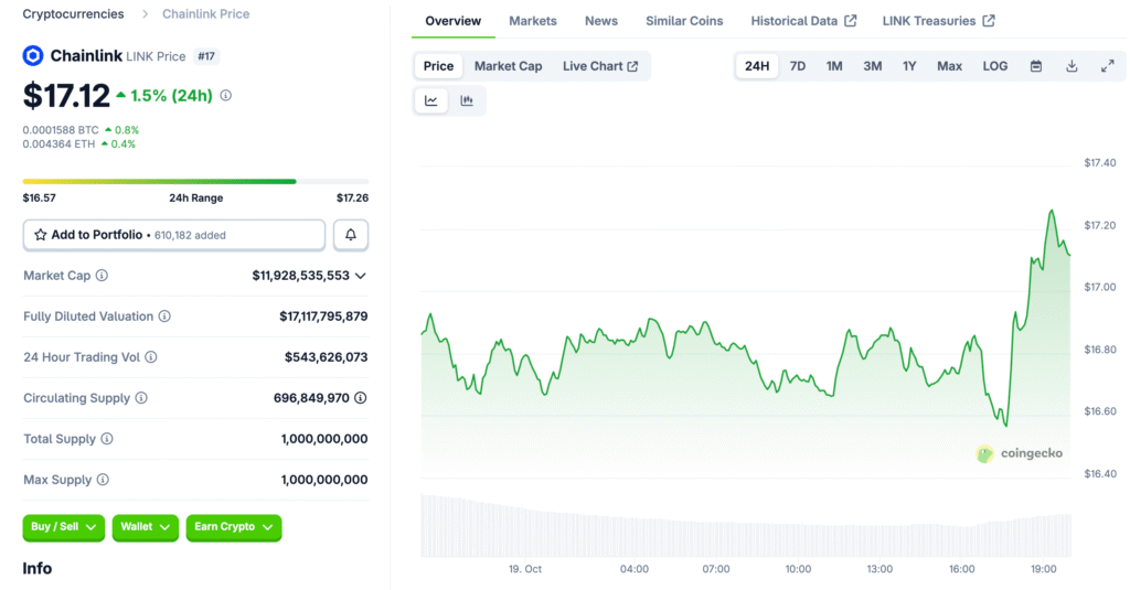 At present, LINK’s 24-hour trading volume sits around $1.32 billion, reflecting moderate activity as traders assess directional clarity. The asset’s market capitalization stands at $11.63 billion, positioning it among the top DeFi-focused cryptocurrencies by value. Price action remains range-bound between $16.60 and $16.80, suggesting temporary consolidation following recent sell-offs. If LINK closes above $17.20, it could signal renewed bullish strength in the coming sessions.