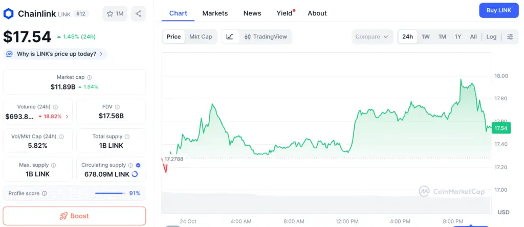 After a week of ups and downs that temporarily brought prices below $17, Chainlink (LINK) is becoming stronger again. The coin has subsequently risen by more than 1.6% and is now trading at around $17.72 as the market steadily becomes more positive.