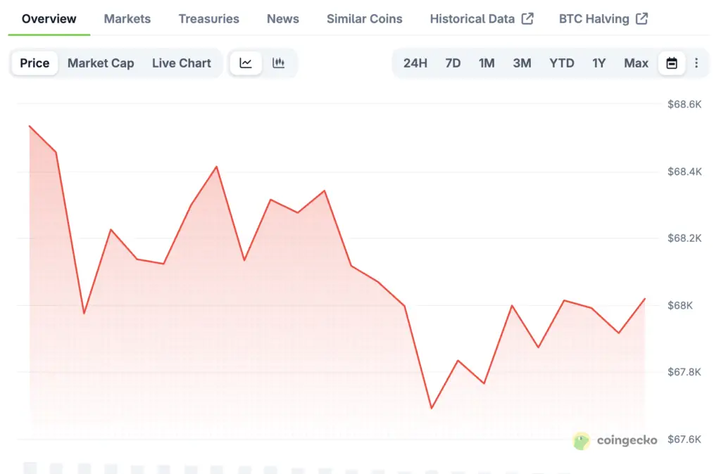 Bitcoin is testing support around $68,000 after falling from higher resistance zones, so technical levels are still very important. If the price breaks below this level, it could go down even more and put more pressure on sellers. Traders are keeping a close eye on these levels for signs of direction.