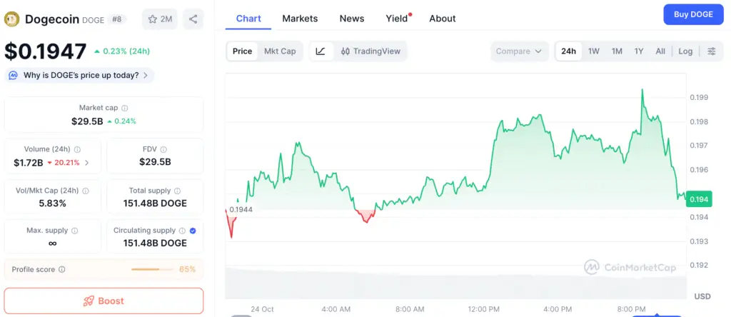 Dogecoin is now trading at around $0.195. Since 2021, it has been heading up in a steady channel, which is a long-term bullish pattern. The coin’s capacity to make higher highs and higher lows shows that investors are still confident, which increases the chance of a big breakout if resistance is broken decisively.