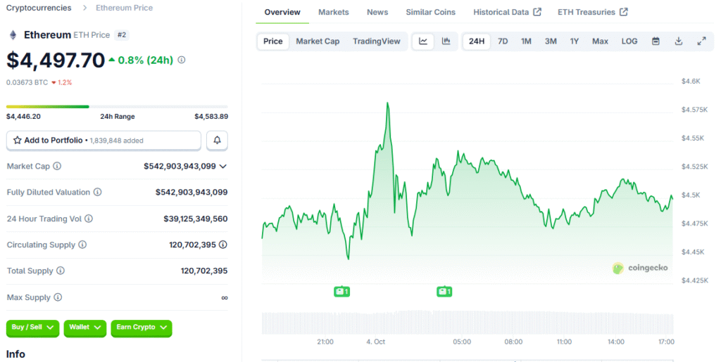 Ethereum pushed to $4,500 after reclaiming its 50‑day simple moving average, extending a multi‑session advance. The level has capped price for weeks, making the current test a key gauge of trend strength.