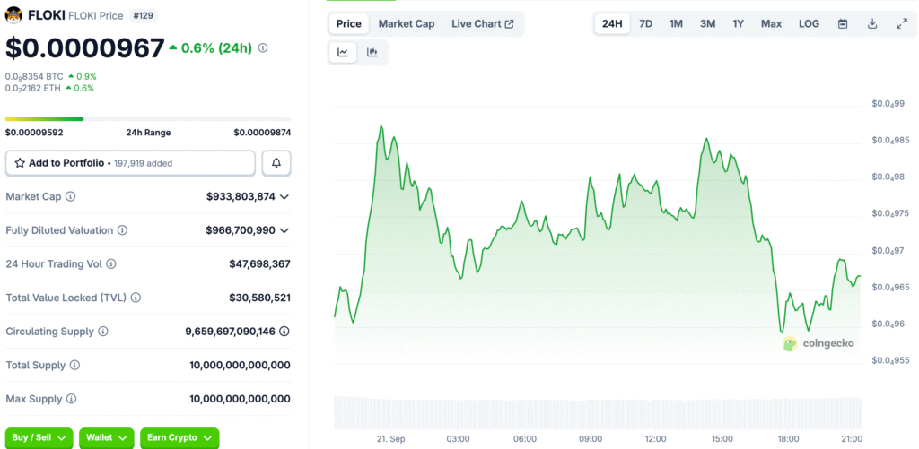 In recent sessions, Floki has been trading between $0.0000945 and $0.0000985, which shows that the price is stable. These small changes suggest that investors are buying more rather than selling out of fear.