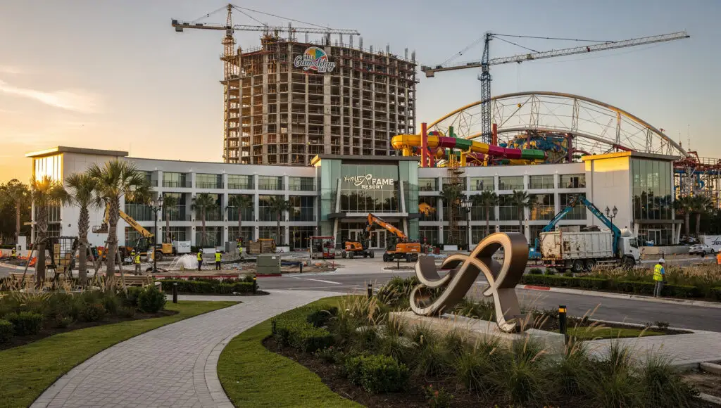 Delays in development had previously stopped major attractions at Hall of Fame Village. The Gameday Bay water park was one of the projects that was affected. A planned hotel project was also put on hold.