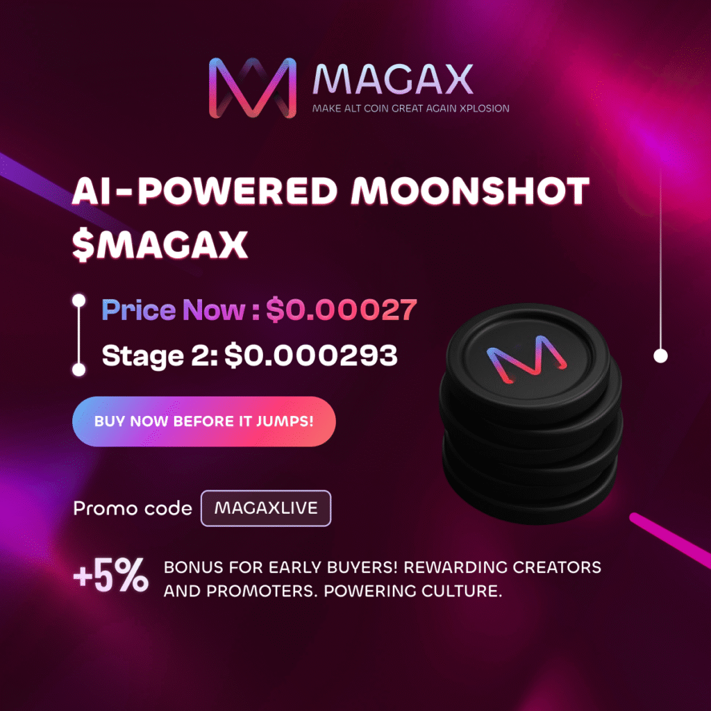 Investor Bonus: MAGAX offers early joiners 5% extra tokens with the code MAGAXLIVE, further multiplying gains for presale participants.