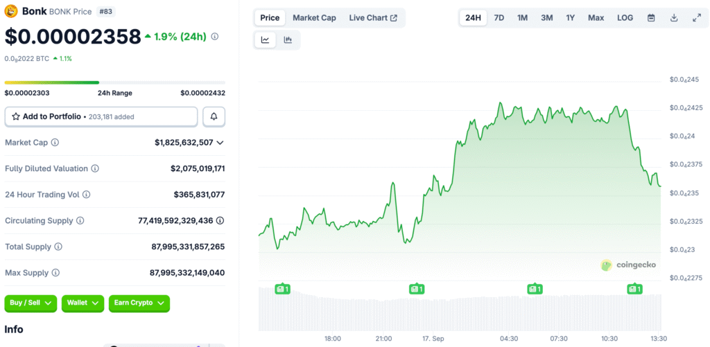 Bonk, a memecoin on the Solana blockchain, has gained popularity due to its utility-driven platforms and cultural significance in the Solana community. Currently worth $1.8 billion, Bonk fits well into decentralized finance systems and maintains high liquidity.