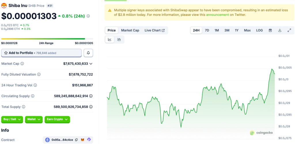 Shiba Inu is trading at about $0.00001303 and is making a symmetrical triangle shape on daily charts. Technical traders are very interested in these kinds of formations because they often happen before big price changes. As the token builds pressure for a move in a certain direction, investors are keeping a close eye on the narrowing structure.