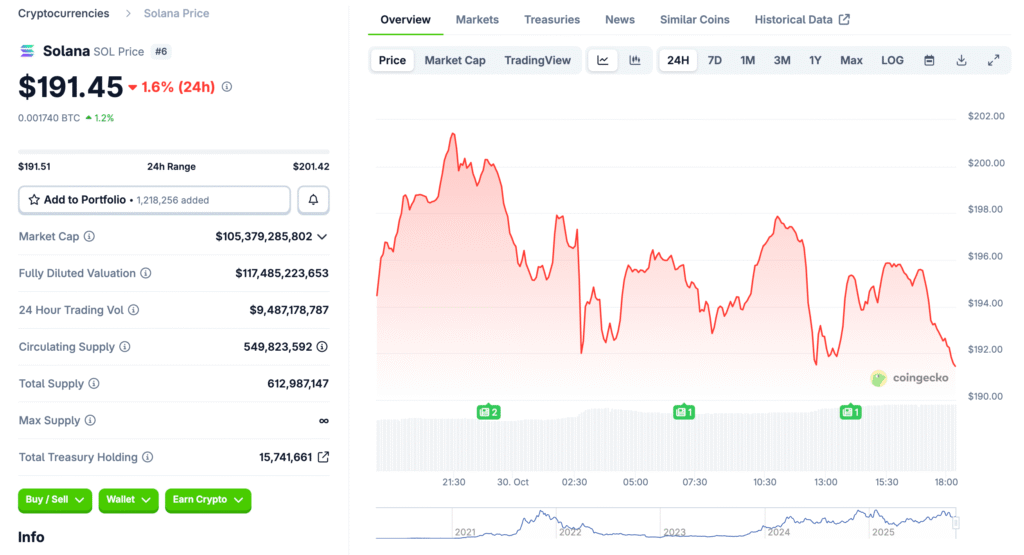 The $175 level remains Solana’s key short-term support zone, acting as both historical resistance and pivot area. A break below this threshold could push prices toward $130, representing a 30% downside risk. Conversely, holding above $175 keeps the door open for recovery toward $200. The next move will likely depend on broader market sentiment and macroeconomic data.
