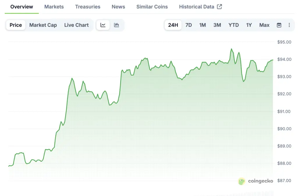 On March 16, Solana USD is trading near $93.8, which means it is gaining momentum again. Over the past 24 hours, the token went up about 2.19%, and over the past week, it went up about 8.01%. As technical signals get stronger, more and more people in the market keep an eye on the asset.