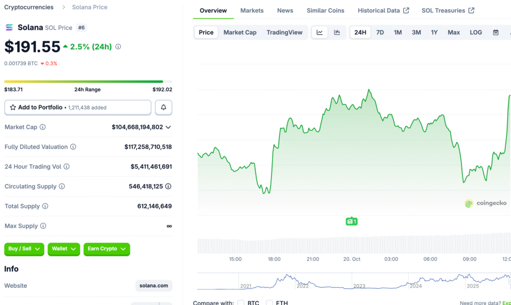 Solana has shown renewed strength after rebounding from a critical support zone around $174, igniting optimism for a potential breakout above $190. Following a volatile week in the broader crypto market, SOL’s recovery has captured traders’ attention, signaling a possible shift toward bullish momentum ahead of a major ecosystem announcement scheduled for October 20.