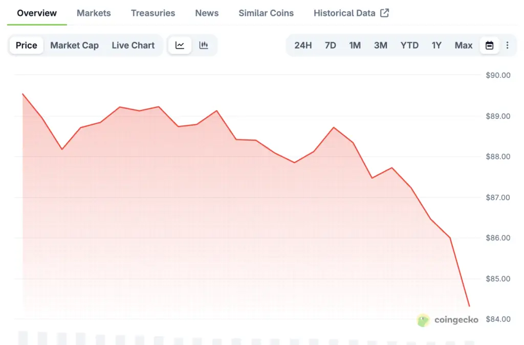 After going up more than 9% during a strong 5-day rally, Solana USD fell 2.31% to about 88.78. The drop is a normal part of the market’s correction phase, when traders take profits after prices have been rising recently. The market is adjusting after quick gains and changing its expectations for how well it will do in the future, as shown by short-term price changes.