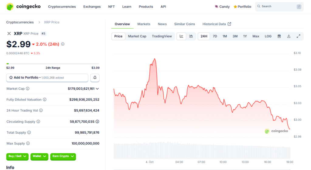 As of early October, XRP trades near $2.98 with steady momentum. A clear push past stacked resistances could unlock upside extensions. Conversely, weakness in Bitcoin could dampen follow‑through for alts. Active management and patience remain key in headline‑driven markets.