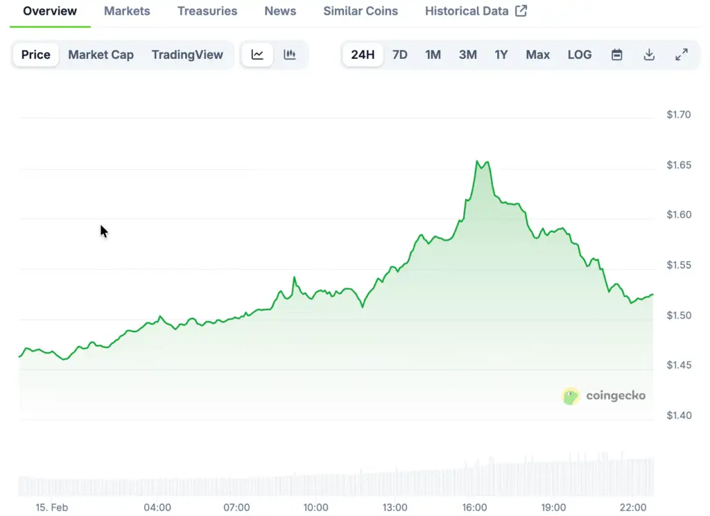 The rally touched an intraday high near $1.54 after rebounding from lows around $1.40, highlighting strong buyer interest. Price action is now stabilizing just below resistance, prompting traders to monitor whether momentum can sustain another upward move.