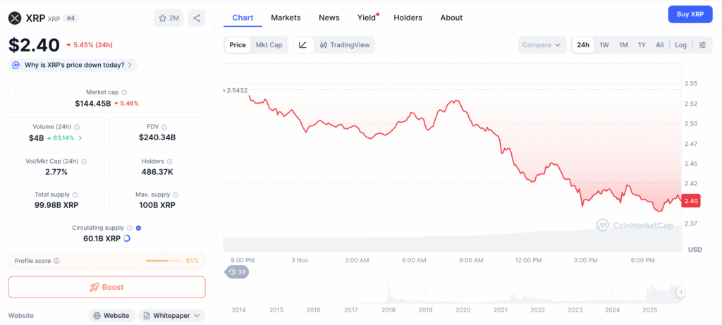 Ripple’s native cryptocurrency XRP is testing a major resistance level at $2.40, a threshold analysts describe as pivotal for the token’s next directional move. After several weeks of consolidation, XRP’s bullish momentum is strengthening as traders anticipate a potential rally toward the $3.60–$10 range in the coming months.