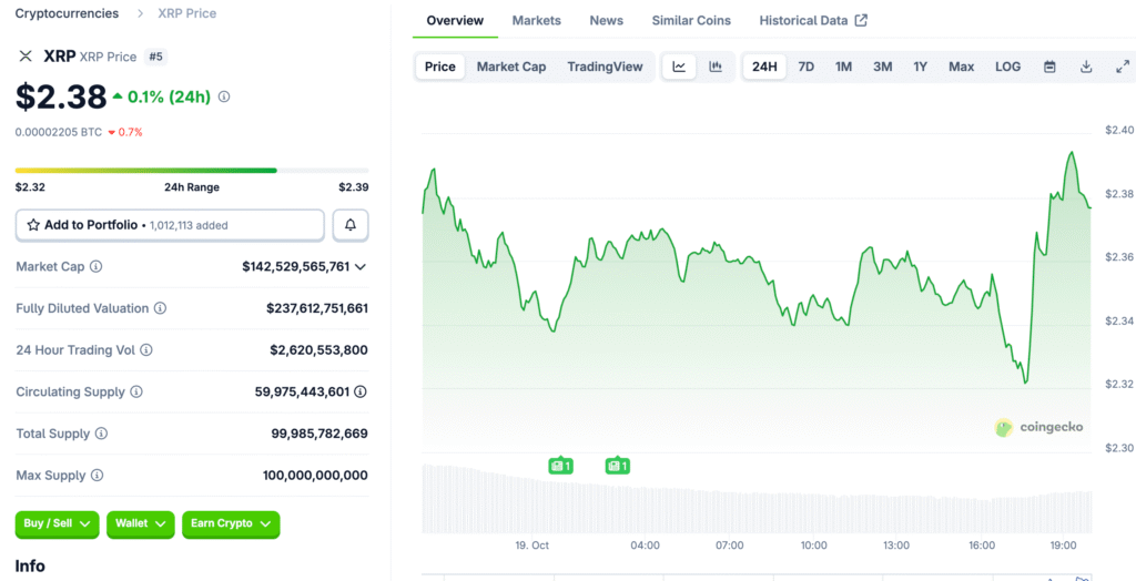 XRP has staged a strong rebound following weeks of downward pressure, outperforming major cryptocurrencies in recent trading sessions. The digital asset climbed over 4% in twenty-four hours to trade near $2.38 after bottoming at $2.25. Analysts attribute this recovery to renewed buying interest among large holders and improving sentiment across the broader crypto market. Despite persistent volatility, XRP’s ability to rebound highlights underlying demand strength.